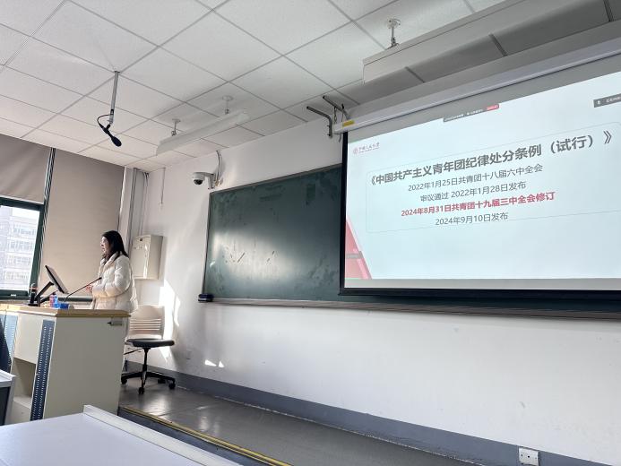 会议伊始,王曼茹带领全体团员集体学习新修订的《中国共产主义青年团纪律处分条例(试行)》,引导团员们深刻领会团纪的重要性和严肃性,进一步强化纪律意识和组织观念,并报告了团支部委员会在组织动员参与学校和学院重要活动中的表现、纪律建设的成果以及前期查摆问题的改进落实状况。